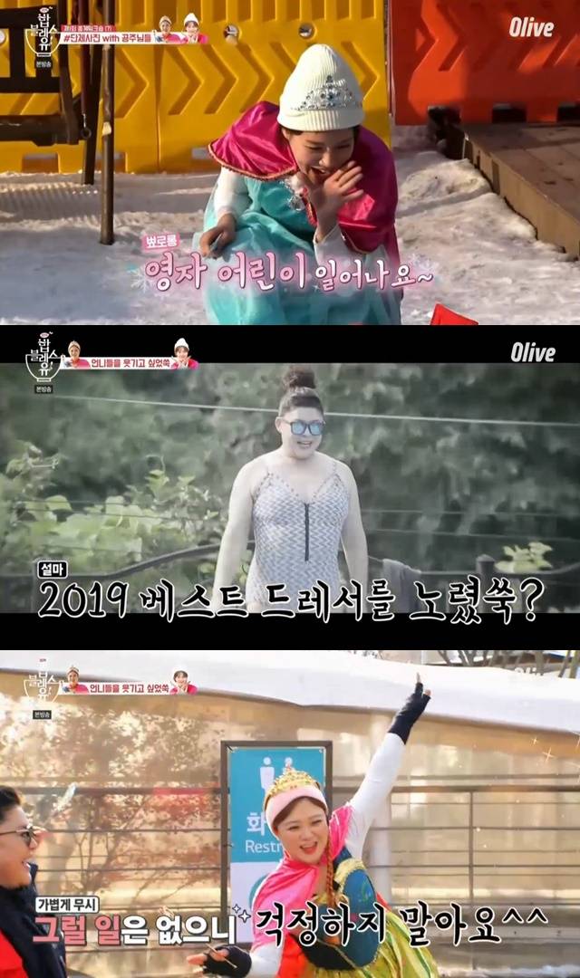 스키장에서 안나와 엘사 분장을 한 김숙과 장도연은 시청자의 고민에 속 시원한 사이다 해결방안을 제시했다. (사진=Olive ‘밥블레스유’ 캡처)