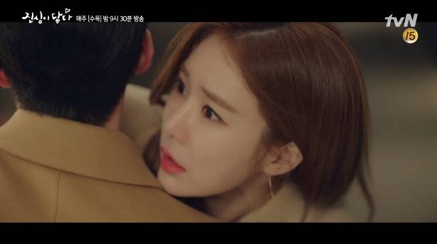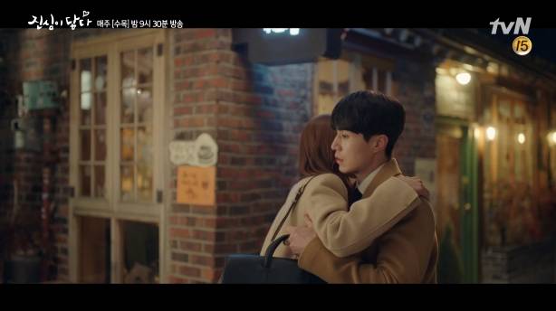 앞서 권정록은 발 삐끗한 오진심을 잡아주지 않았던 상황. 이번엔 그를 안듯 잡아주며 "이번엔 안 피했다"고 말해 로맨스의 시작을 알렸다.(사진=tvN '진심이 닿다' 캡처)