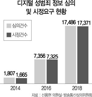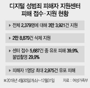 ◇법 개정·인공지능(AI) 기술 개발 등 뒤따라야=현장 활동가와 경찰은 적절한 법 개정과 제도적 조치가 동반돼야 한다고 말한다. 서승희 한국사이버폭력대응센터 대표는 “최근 피해지원 사례가 눈에 띄게 줄어든 것은 아니지만 불법촬영물 유포를 방치하던 웹하드와 불법사이트가 위축되면서 유포 규모가 축소됐다”면서도 “웹하드 사업자들의 불법적 행태를 전기통신사업법 개정을 통해 규제할 수 있어야 한다”고 지적했다. 사업자가 불법행위에 대해 조치하지 않으면 2,000만원의 과태료를 부과받도록 지난해 전기통신사업법이 개정됐으나 시민단체는 모든 불법정보에 대한 필터링을 의무화해야만 근본적인 문제 해결이 가능하다는 입장이다. 한편 일선 사이버성폭력 담당 경찰은 인력 충원과 기술 개발을 가장 큰 과제로 꼽았다. 서울 일선서 사이버수사팀 관계자는 “유포 범죄 특성상 수사 착수 단계에서 피해 규모가 특정되지 않으면 유포 범위에 대해 경찰관 수 명이 달라붙어 웹하드 사이트 전체를 들여다봐야 하는 실정”이라며 “인공지능(AI)을 활용한 자동 필터링 기술 개발이 시급하다”고 말했다. 경찰청은 올해 들어 전국 17개 지방청에 설치된 사이버성폭력 전담 경찰 91명을 정식 직제화했다. /오지현기자 ohjh@sedaily.com