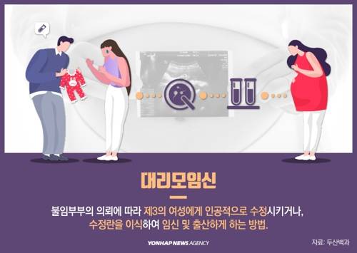 (서울=연합뉴스) 박성은 기자 = 한국에 살던 A 씨 부부. 자연적인 임신이 어렵던 그들은 2016년 대리모를 통해 아이를 갖기로 마음먹었다. A 씨 부부의 수정란을 착상한 대리모 B 씨는 2017년 3월 미국에서 딸을 출산했다. 문제는 친자등록이었다. 서울의 한 구청이 출생신고를 거부하자 A 씨 부부는 소송을 냈다. 하지만 법원은 1심과 항고심에서 모두 "체외수정해 얻은 자녀는 낳아준 대리모가 친어머니"라고 판결했다.
