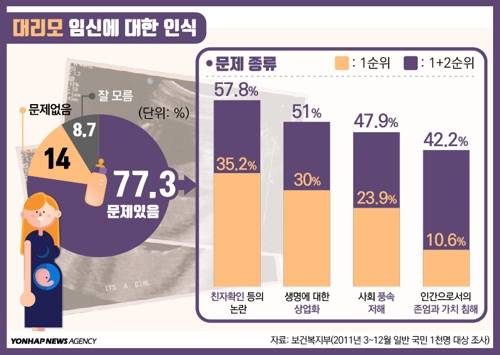 보건복지부가 지난 2012년 발표한 '생명나눔 인식도 조사결과'에 따르면 국민 대다수(85.3%)는 대리모 출산 자체에 부정적인 것으로 조사됐다. 또 77.3%는 대리모 임신이 윤리적으로 문제가 있다고 답했으며, 그 이유로 '친자 확인 등의 논란'(35.2%) '생명 상업화'(30.0%) '사회풍속 저해'(23.9%)를 꼽았다.