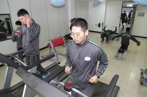 체력단련실에서는 여인우 상병이 휴대전화에 연결된 이어폰으로 음악을 들으며 러닝머신 위를 달리고 있다. 어느 정도 몸이 풀렸는지 유튜브에서 ‘벤치프레스의 올바른 운동법’ 영상을 보며 한껏 자세를 잡아본다.