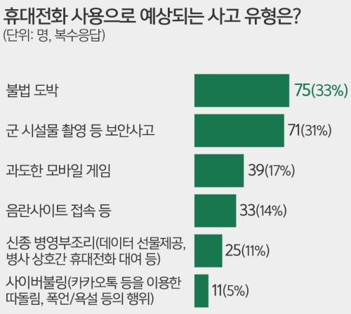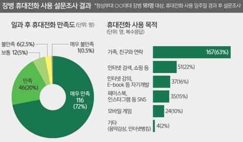 최 일병은 “개인 휴대전화를 쓰니 카톡도 주고받을 수 있고, 여자친구가 먼저 전화할 수 있는 점도 좋은 것 같다”며 “공중전화나 생활관마다 한 대씩 배치된 용사수신용핸드폰에 비해 프라이버시도 보장될 수 있다”고 말했다.