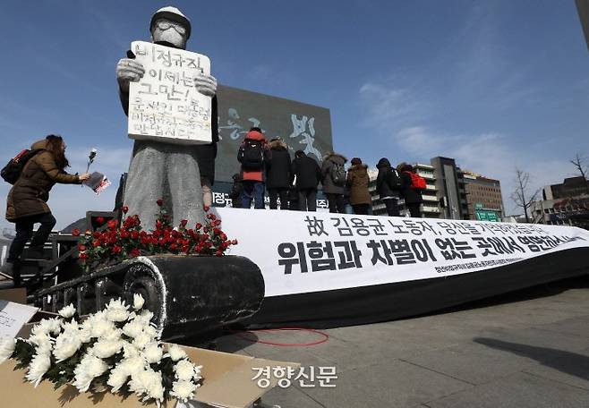 ‘청년 비정규직 고 김용균 민주사회장’ 영결식이 지난 9일 서울 광화문광장에서 열렸다. 어머니 김미숙씨는 헌사에서 “너의 죽음이 헛되지 않도록, 많은 사람들이 너를 오랫동안 잊지 않고 기억하길 바라는 마음이 간절하다”고 했다. 김씨 사망 이후 ‘위험의 외주화’로 대표되는 하청 노동의 구조적 문제와 2인1조 근무 원칙 등 기본 노동 요건도 갖추지 못한 열악한 현실이 다시 불거졌다. 서울과 충남 태안에서 진행된 영결식에는 김씨의 동료 노동자들과 시민 약 3000명이 모였다. 유해는 전태일 열사 등 민주열사 묘역이 있는 경기 남양주시 마석 모란공원에 안장됐다.