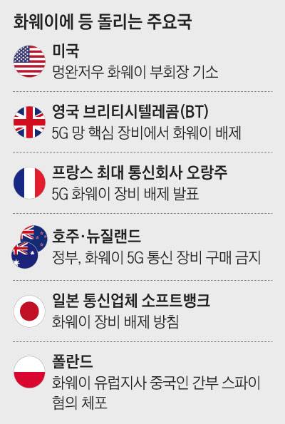 '화웨이 파장'은 한국에도 닥칠 전망이다. 국내 통신 3사 가운데 LG유플러스는 화웨이의 통신 장비를 이용해 수도권과 강원도 지역의 5G(5세대 이동통신) 기지국을 구축하고 있다. LG유플러스는 기존 LTE(4세대 이동통신) 기지국에도 화웨이 통신 장비를 사용했다. 국내 LTE 기지국 가운데 화웨이 장비 비중은 약 12~ 15%로 추산된다. 당시 미국이 반발하지 않도록 수도권 미군 주요 시설 주변 기지국에는 화웨이가 아닌 삼성전자나 노키아 장비를 사용했고, 화웨이 장비의 국제 보안 인증을 따로 받았다. 과기정통부 관계자는 "통신 장비는 통신업체들이 직접 선정하는 것"이라며 "국내 일부 통신 업체가 화웨이 5G 장비를 사용하는 데 대해 미국 정부가 아직 우리에게 우려를 전해온 것은 없다"고 했다.