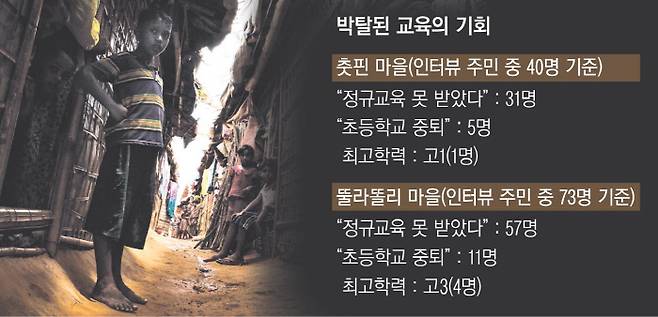 로힝야 마을 주민들은 대체로 정규교육을 제대로 받지 못했다. 아디와 인터뷰한 춧핀 마을 주민 40명 중 9명만 학교를 다녔다. 9명 중 5명은 초등교육을 마치지 못했다. 최고학력은 10학년(고1)이었다. 뚤라똘리 마을에서도 78%의 주민이 정규교육을 받지 못했다고 답했다. 로힝야 학생들은 대학입학 시험도 치를 수 없었다.