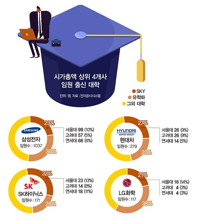 전자공시시스템에 따르면 시가총액 상위 10개사(삼성전자, SK하이닉스, 현대차, 셀트리온, LG화학, 삼성바이오로직스, 포스코(POSCO), 네이버(NAVER), 삼성물산, SK텔레콤) 중 지난해 3분기 말 기준 임원의 학력을 공시한 7개사의 미등기 임원은 모두 1847명이다. 이중 최종학력 기준으로 서울대, 고려대, 연세대에서 학사나 석사·박사 학위를 취득한 임원은 모두 428명으로 집계됐다. 이들 기업의 임원 중 해외에서 최종학업을 마친 경우는 500명으로 더 많았다.