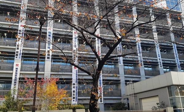 | ▲ 우에노의 한 고등학교 건물에 걸려있는 현수막. 대부분이 대회에 참가하는 것을 축하하는 내용이다. |