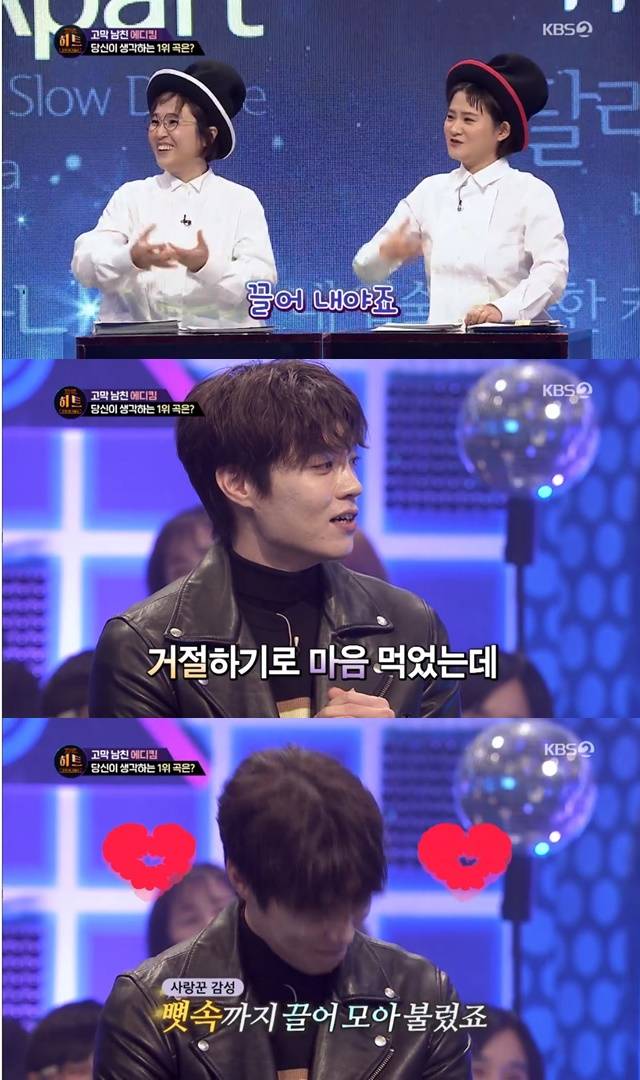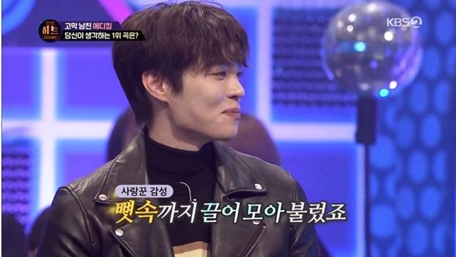 에디킴은 “그런데 드라마 ‘도깨비’ OST라는 사실을 들었다. ‘도깨비’를 검색해보니까 무척 대단한 드라마더라. 꼭 해야겠다는 생각을 하고 모든 사랑꾼 감성을 끌어 올렸다”고 솔직하게 털어놔 방송에 웃음을 더했다. (사진=KBS 2TV ‘뮤직셔플쇼 더 히트’ 캡처)
