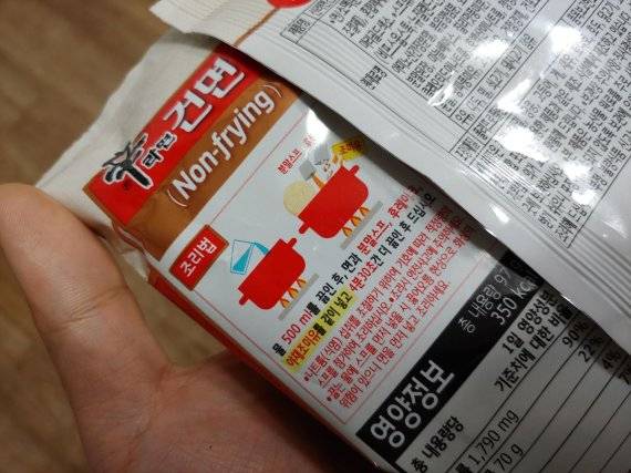 처음 눈에 띄는 건 포장이다. 새빨간 색이 상징이던 신라면이 누런빛이 감도는 흰 배경으로 덮였다. 포장만 봐도 전보다 건강해 보인다는 인상이 드는 건 기분 탓이다. 눈에 들어오는 글자는 ‘건면’과 ‘Non-frying’. 뒷면엔 ‘칼로리 350kcal, 지방 3.6g’이란 글자가 눈에 띄게 박혔다. 기존 신라면이 520kcal에 지방 16g이었으니 대폭 줄어든 건 분명하다.