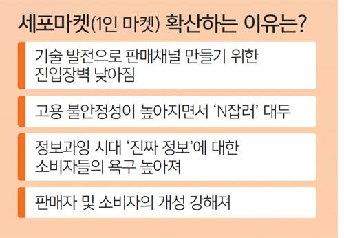 개인의 취향을 중시하는 소비자들이 늘어나는 것도 세포마켓의 성장을 견인한 원동력이다. 김 교수는 “요즘은 ‘다품종 소량 시대’이다 보니 예전에는 백화점식 판매방식을 선호했지만 요즘은 한 가지라도 자기 전문 분야를 선호하고 파고드는 성향이 강해지면서 소비도 이 같은 방식으로 세분화되고 있는 것”이라고 분석했다.