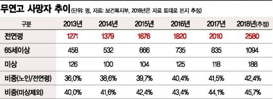 보건복지부에 따르면 국내 무연고 사망자 수는 2013년 1271명, 2014년 1379명, 2015년 1676명, 2016년 1820명으로 꾸준히 늘어나다 2017년 처음으로 2000명을 돌파했다. 정식 통계가 집계된 지난해 상반기에만 1290명의 무연고 사망자가 발생해 연간 추정 2500명을 넘어섰다. 매년 꾸준한 오름세를 보인 것은 물론 5년 새 2배가량 증가한 것이다.