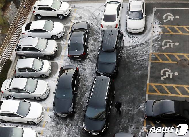 (세종=뉴스1) 장수영 기자 = 18일 정부세종청사 국토교통부에서 열린 공공기관장 간담회에 참석한 기관장 차량들이 장애인 주차구역 출입로를 막고 있다. 2019.2.18/뉴스1