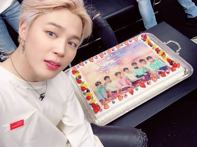 공개된 사진 속 지민은 일본 돔 콘서트를 마무리한 후 대기실에서 방탄소년단 콘서트 포스터가 그려진 케이크를 배경으로 사진을 찍는 모습이다.