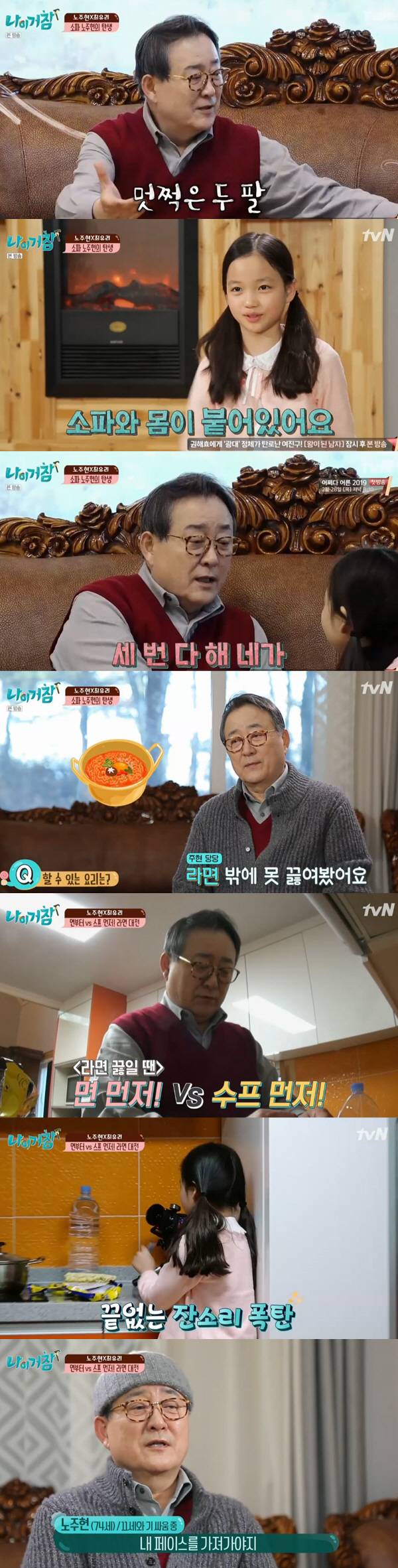 최유리는 "세 끼를 다 먹어야 한다. 닭볶음탕을 좋아한다"고 말했지만, 노주현은 "세 번 다 네가 해"라면서도 직접 라면 끓이기에 나섰다. 이때 면 먼저냐, 수프 먼저냐를 시작으로 최유리의 잔소리 폭탄이 시작됐고, 노주현은 "오늘 따라 가기 시작하면 계속 그럴 것 같다. 내 페이스를 가져가야한다. 페이스에 말리면 안 될 것 같다"며 11세와의 기 싸움으로 웃음을 안겼다.