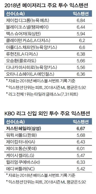 지난해 아로디스 비스카이노(애틀랜타)가 던진 시속 97.3마일(156.5km) 투심패스트볼의 체감 구속은 시속 95.7마일(154km)이었다. 그러나 회전 수가 비슷했던 에드윈 디아스(뉴욕 메츠)의 시속 97.3마일(156.5km) 투심패스트볼의 체감 구속은 시속 97.6마일(157km)이었다. 디아스의 익스텐션은 6.6피트(201.1cm)로 5.5피트(167.6cm)인 비스카이노보다 1.1피트(33.5cm) 더 길었다. 체감 구속의 차이를 결정한 요인이었다. 삼성이 헤일리를 영입할 때 익스텐션에 집중한 이유다.
