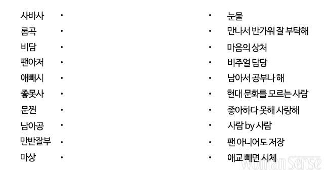 사바사 사람 by 사람 롬곡 눈물 비담 비주얼 담당 팬아저 팬 아니어도 저장 애빼시 애교 빼면 시체 좋못사 좋아하다 못해 사랑해 문찐 현대 문화를 모르는 사람 남아공 남아서 공부나 해 마상 마음의 상처 만반잘부 만나서 반가워 잘 부탁해