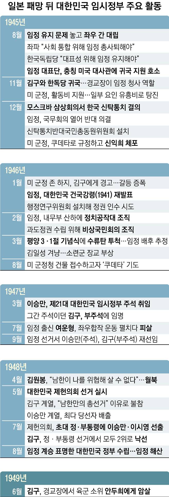 이후 김구의 여러 정치적 시도는 번번이 무산됐다. 1948년 5월 10일 총선거가 실시돼 8월 15일 대한민국 정부가 세워졌다. 9월 9일 북한에서도 조선민주주의인민공화국이 수립됐다. 38선을 경계로 국토와 민족이 둘로 나뉘었다. 임정 세력이 주축이던 한국독립당은 “남한만의 정부 수립에 반대한다”며 총선 참여를 거부했다. 제헌의회에서 정치권력을 얻지못한 한독당은 결국 세를 잃고 와해됐다. 당시 국제 정세와 한국사회 분위기를 제대로 읽지 못한 ‘패착’이었다는 평가가 많다.
