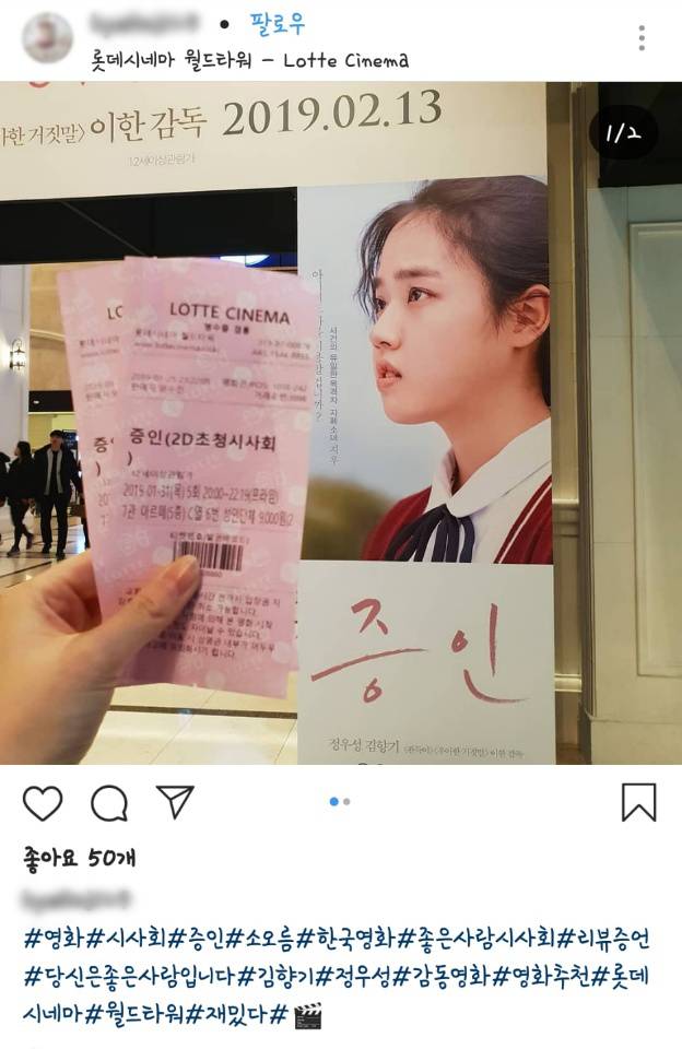 뿐만 아니라, “태어나줘서 고마운 영화”(인스타그램_family****), “'말아톤' 이후 이런 영화를 제작해줘 감사하다고 말하고 싶다”(블로그_msim****), “보석 같은 배우들의 열연에 흠뻑 빠져 있다 나왔다. 마음이 깨끗해진 느낌! ‘좋은 사람’으로 살아갈 힘을 주는, 향기로운 영화를 만들어 주신 분들께 고맙다”(CGV_SWT_MO****), “늦겨울 극장가의 확실한 다크호스”(블로그_cine21****) 등 남녀노소 관객들의 극찬이 끊임없이 이어지고 있어 2월 극장가를 강타한 '증인' 열풍을 더욱 실감케 한다. (사진=롯데엔터테인먼트, 인스타그램 제공)