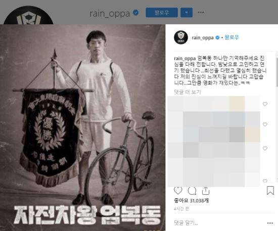 비는 25일 인스타그램에 “엄복동 하나만 기억해주세요. 진심을 다해 전합니다. 밤낮으로 고민하고 연기 했습니다”라면서 “ 최선을 다했고 열심히 했습니다. 저의 진심이 느껴지길 바랍니다. 고맙습니다”라고 썼다. 이어 “그만큼 영화가 재밌다”며 웃음을 나타내는 ‘ㅋㅋ’을 남기기도 했다.