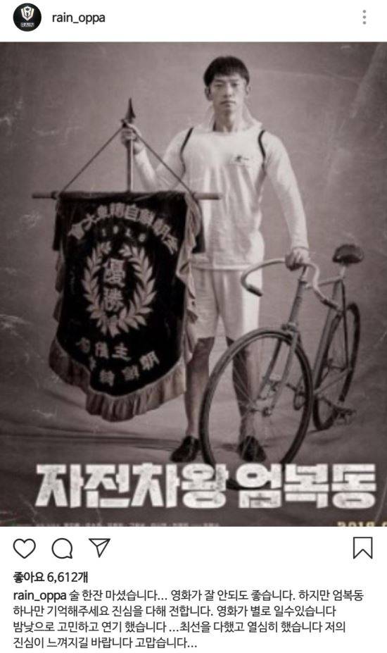 가수 비(정지훈)가 SNS에 개봉 예정인 영화 '자전차왕 엄복동'에 대해 "영화가 별로일 수 있다"는 말을 남겼다가 삭제했다.