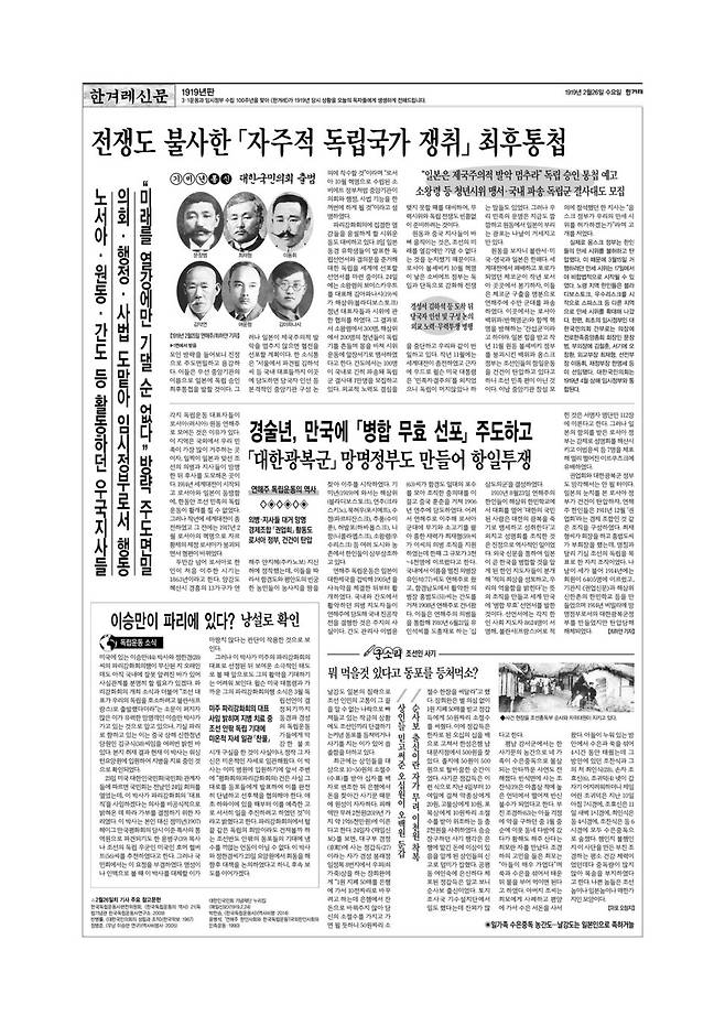 <편집자 주> 올해는 3·1운동과 대한민국임시정부 수립 100주년입니다. 역사적인 해를 맞아 <한겨레>는 독자 여러분을 100년 전인 기미년(1919)의 오늘로 초대하려 합니다. 살아 숨 쉬는 독립운동가, 우리를 닮은 장삼이사들을 함께 만나고 오늘의 역사를 닮은 어제의 역사를 함께 써나가려 합니다. <한겨레>와 함께 기미년 1919년으로 시간여행을 떠날 준비, 되셨습니까?