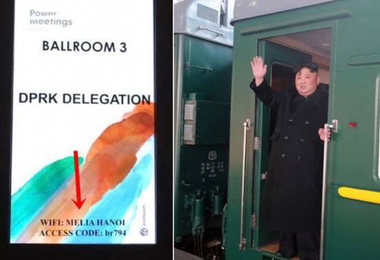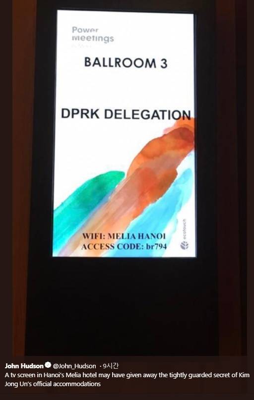 미국 워싱턴포스트의 존 허드슨 기자는 25일 트위터에 멜리아 호텔의 한 연회장 앞 전자 알림판에 ‘북한 대표단’이라고 적힌 것을 촬영해 공개했다. 화면에 있는 ‘DPRK(Democratic People’s Republic of Korea) DELEGATION’ 영문 아래에는 무료 인터넷을 사용하기 위한 와이파이 정보도 떠 있다. 허드슨 기자는 이런 정보가 멜리아 호텔이 김 위원장의 공식 숙소임을 간접적으로 알려준다고 전했다.