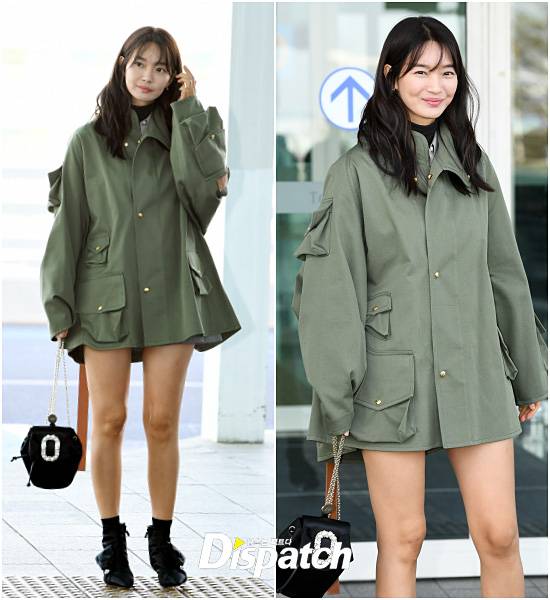 신민아는 카키색 야상점퍼와 하이힐, 미니백을 매치해 캐주얼한 공항패션을 완성했다.