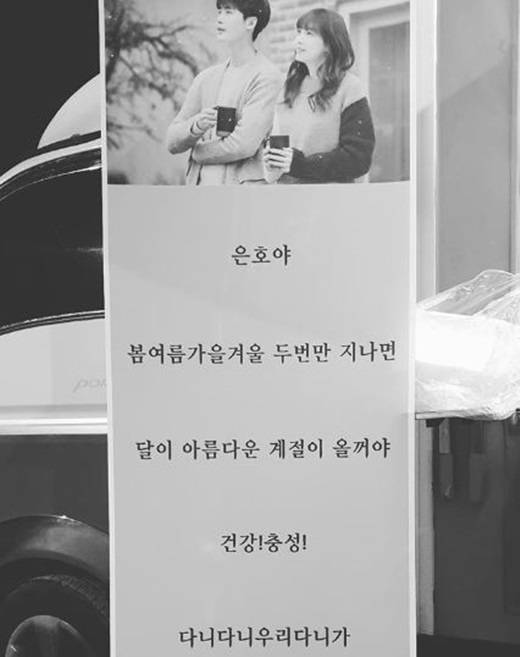 공개된 사진은 이나영이 이종석을 위해 준비한 간식차. 이나영은 그에게 "은호야. 봄여름가을겨울 두 번만 지나면 달이 아름다운 계절이 올 거야. 건강! 충성! 다니다니우리다니가(단이단이우리단이)"라고 적으며 드라마 대사를 활용한 재치 있는 메시지를 남겼다.