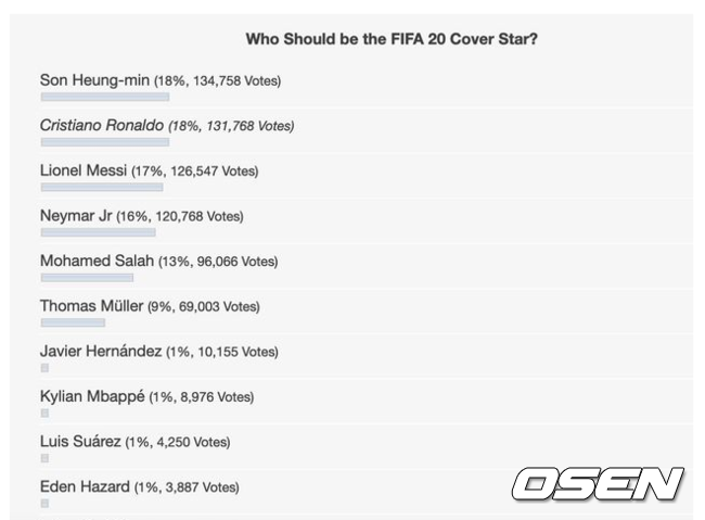 손흥민(토트넘)이 크리스티아누 호날두(유벤투스)와 리오넬 메시(바르셀로나)를 제치고 1위에 올랐다. 축구 게임 FIFA 20의 표지 모델 투표 중간 결과다.