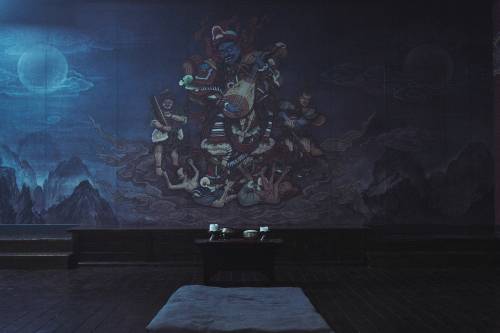 | 영화 ‘사바하’의 태백 사슴동산 법당의 탱화. 동쪽 사천왕인 지국천왕이 비파를 들고 악귀를 밟고 있다. CJ엔터테인먼트 제공 |