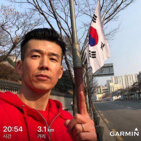 사진 속에는 3.1km 달리기를 끝낸 뒤 인증사진을 찍는 션의 모습이 담겼다. 션은 가로수에 게양된 태극기를 가리키고 있다. 션의 훈훈한 비주얼이 눈길을 끈다.