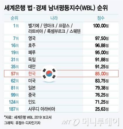 세계은행이 발표한 보고서에서 한국의 법적·경제적 남녀평등지수가 187개국 중 57위라는 결과가 나왔다. 이 중 남녀에게 온전히 동등한 권리를 주는 국가는 6개국에 불과한 것으로 나타났다.