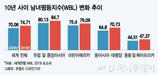 보고서는 지난 10년간 전반적으로 성별 간 법적·경제적 평등이 이전보다 이뤄졌다고 평가했다. 실제로 10년 전 조사 때는 남녀에게 온전히 평등한 권리를 부여한다는 평가를 받은 국가(만점인 100점을 받은 국가)가 하나도 없었다.