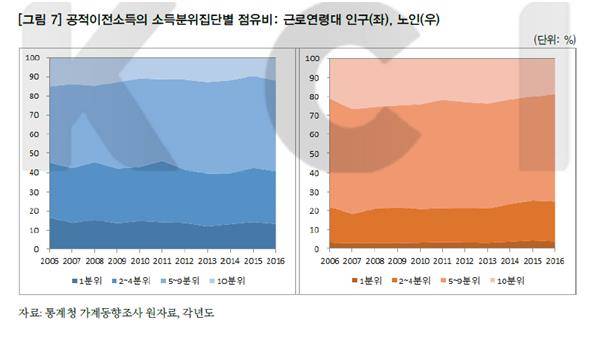 그러나 노인집단과 다르게 근로연령대 집단에서 불평등 개선효과는 미미했다. 노인의 경우 1~4분위 저소득층의 공적이전소득 점유비가 늘었으나 근로연령대 인구에서는 5~9분위의 점유비만 늘어날 뿐이었다.