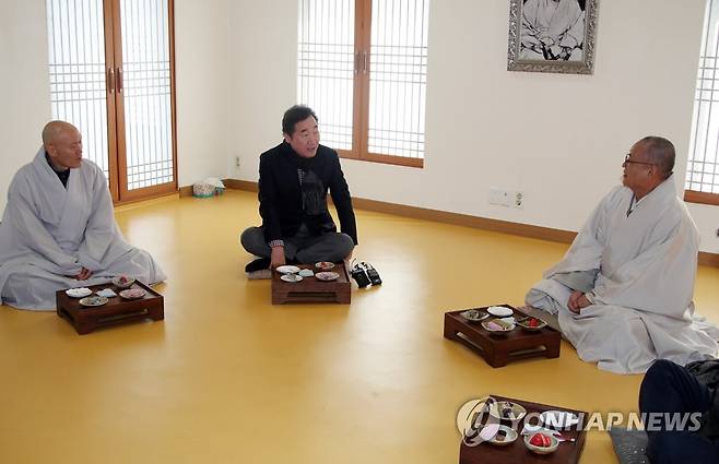 (인천=연합뉴스) 김승두 기자 = 이낙연 국무총리가 9일 오전 강화도 전등사에서 주지스님 등과 대화하고 있다. 2019.3.9
