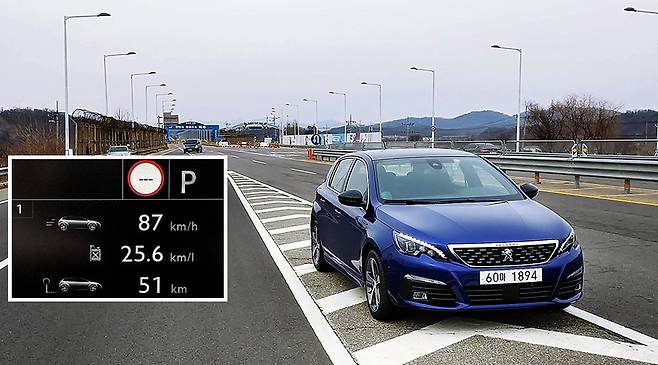 푸조 308 GT라인의 자유로 주행이 끝난 후 도로 한 켠에 차량을 세웠다. 그리고 트립 컴퓨터의 기록을 확인했다. 푸조 308 GT라인은 평균 87km/h의 속도로 총 51km를 달렸고, 그리고 그 결과 리터 당 25.6km에 이르는 압도적인 효율성을 과시했다.