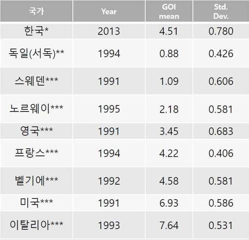이보다 약 10년 전 수치지만, 유럽 국가들과 미국을 대상으로 측정된 GO지수는 이탈리아(7.64)·미국(6.93)·벨기에(4.58)·프랑스(4.22)가 높은 그룹, 노르웨이(2.18)·스웨덴(1.09)·독일(0.88)이 낮은 그룹이다. 우리나라는 높은 축에 속한다.