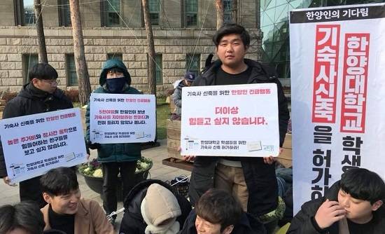 | ▲ 한양대 학생들이 기숙사 신축을 요구하는 시위를 벌이고 있다. |