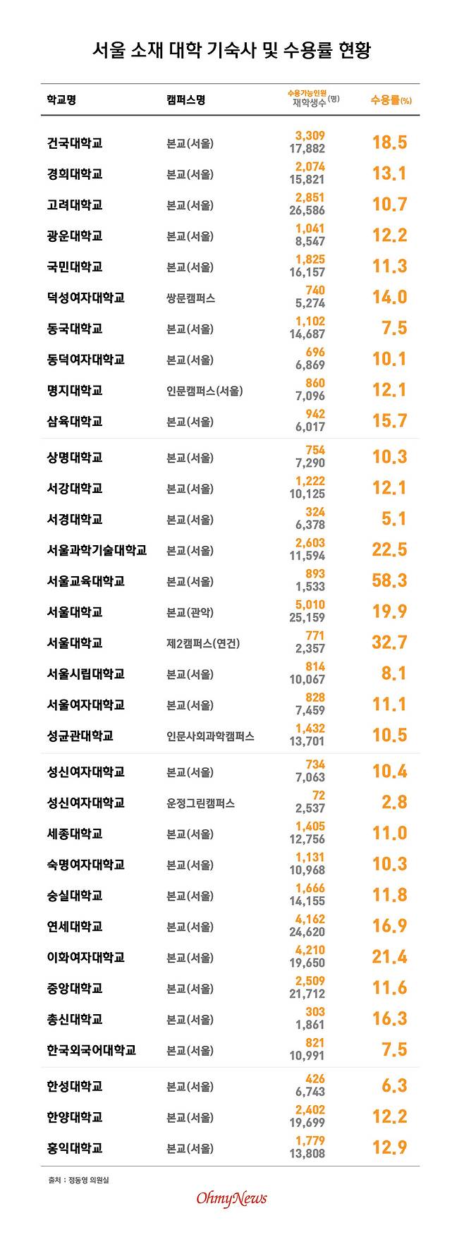 | ▲ 서울 소재 대학 기숙사 및 수용률 현황 |