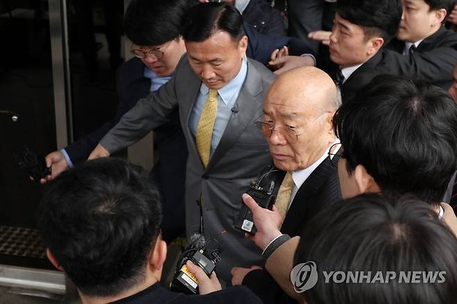 (광주=연합뉴스) 정회성 기자 = 전두환 전 대통령이 11일 광주지방법원에 출석, 취재진 질문을 "왜 이래"라고 답하며 건물로 들어서고 있다.