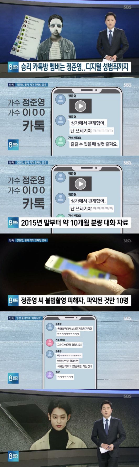 'SBS 8 뉴스'는 지난 11일 정준영이 지난 2015년 말부터 10개월 간 여성들과 성관계한 영상을 몰래 촬영하고, 이를 메신저 단체 채팅방에 유포했다고 보도했다. 보도에 따르면, 정준영은 채팅방 멤버들에게 성관계 사실을 알린 뒤, 멤버들의 요청이 있을 시 해당 영상을 공유했다. 이미 추산되는 피해자만 10명이 넘는다고 한다.