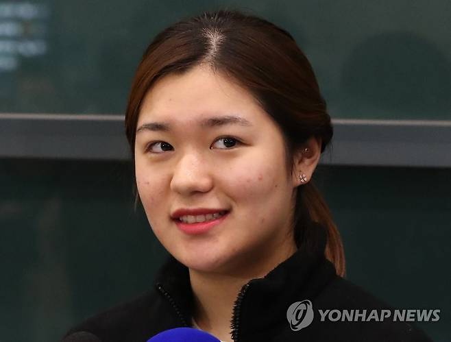 (영종도=연합뉴스) 김도훈 기자 = 불가리아 소피아에서 열린 2018-2019 국제빙상경기연맹(ISU) 쇼트트랙 세계선수권대회에서 여자 3000미터에서 금메달을 차지한 김지유가 12일 오후 인천국제공항을 통해 귀국해 입국장에서 취재진과 인터뷰를 하고 있다.2019.3.12