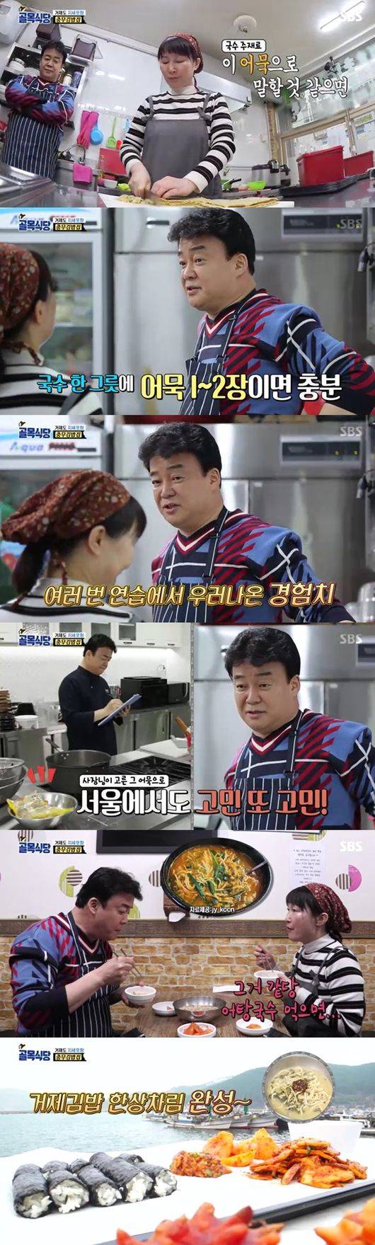서울에서도 수없이 고민하며 연습했던 레시피였다.기존에 있던 시락국에 국수와 어묵을 추가한 '어묵시락국수'가 탄생됐다. 사장은 "어탕같다"며 만족감을 드러냈다. 이로써 거제김밥의 한상차림이 완성됐다.