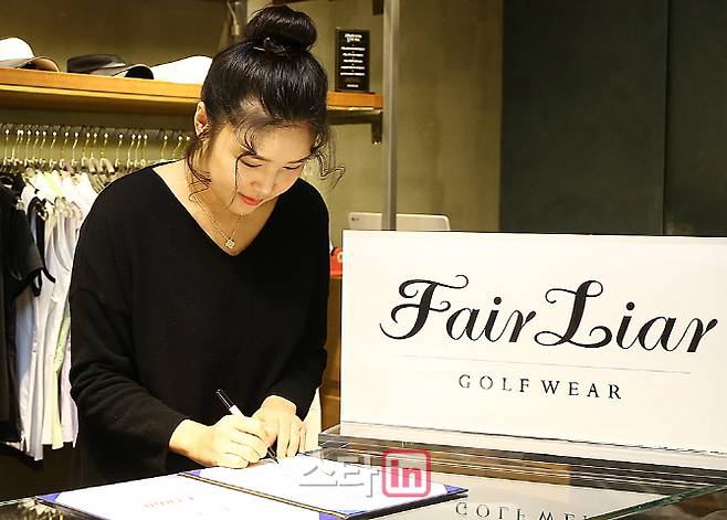 [이데일리 골프in 조원범 기자]15일 서울 강남에 위치한 신세계백화점에서 '페어라이어(Fair Liar) 조인식'이 열린가운데 윤지나 대표가 사인하고 있다.