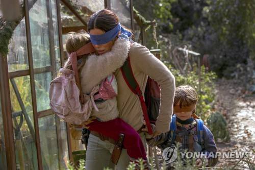 This image released by Netflix shows Sandra Bullock in a scene from the film, "Bird Box." Netflix will remove footage of a real fiery train disaster from its hit post-apocalyptic survival film "Bird Box" months after the streaming giant was criticized for exploiting a tragedy. The stock footage was taken from a 2013 crash in the Quebec town of Lac-Megantic when a train carrying crude oil came off the tracks and exploded into a massive ball of fire, killing 47 people. (Saeed Adyani/Netflix via AP)