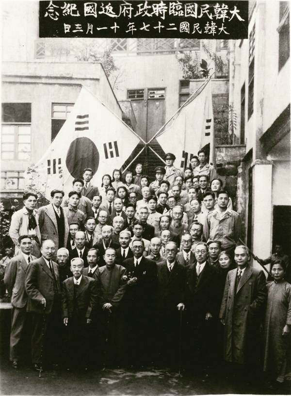 | ▲ 1945년 11월 3일, 중국 충칭 대한민국임시정부 청사 앞에서 임시정부 요인들이 환국기념촬영을 하고 있다. 김구선생 바로 뒤쪽에 서있는 인물이 김상덕 선생이다. |