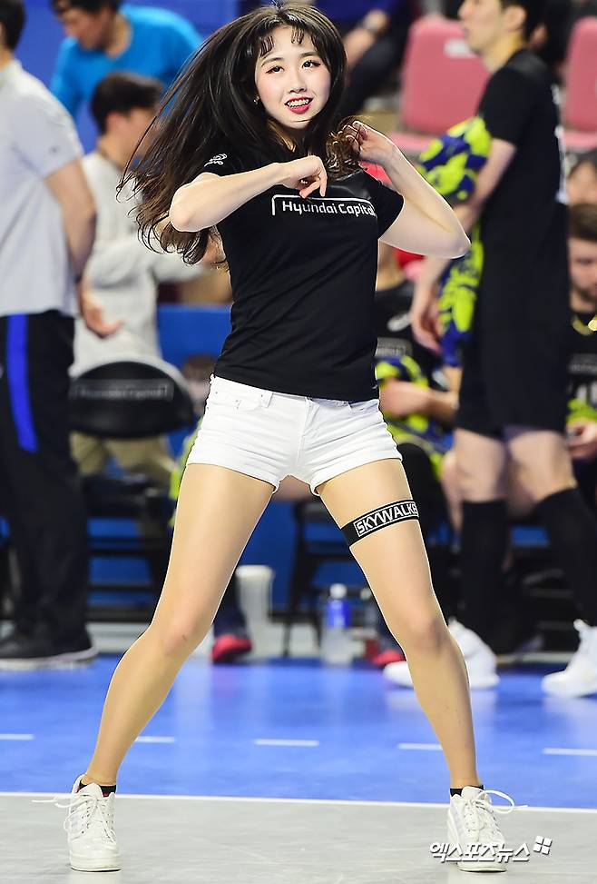 [엑스포츠뉴스 천안, 김한준 기자] 16일 오후 충청남도 천안유관순체육관에서 열린 '2018-2019 도드람 V리그' 현대캐피탈과 우리카드의 남자부 플레이오프 1차전 경기, 현대캐피탈 치어리더 안민정이 멋진 공연을 선보이고 있다.