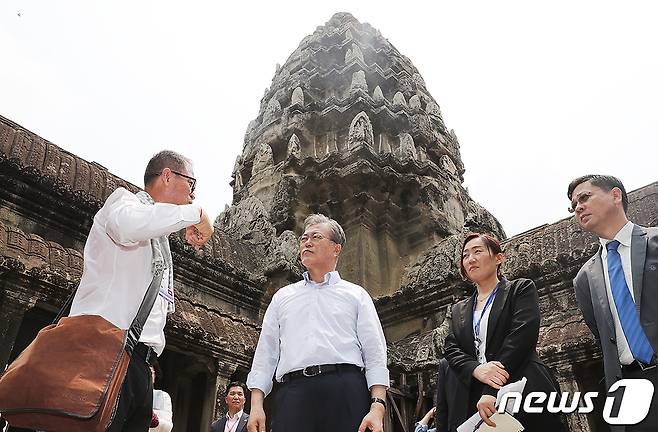 문재인 대통령이 16일 오후(현지시간) 캄보디아 현지 대표 문화재이자 세계문화유산인 앙코르와트를 둘러보고 있다.(청와대 제공) 2019.3.17/뉴스1
