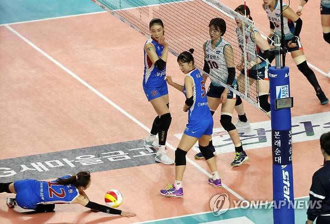 (김천=연합뉴스) 김준범 기자 = 19일 경북 김천실내체육관에서 열린 프로배구 여자부 플레이오프 3차전 한국도로공사와 GS칼텍스의 경기. 양팀 선수들이 도로공사 문정원 수비 모습을 바라보고 있다. 2019.3.19